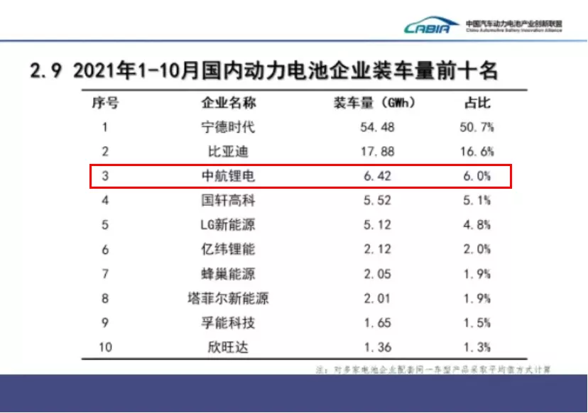 在10月底韓國(guó)市場(chǎng)研究機(jī)構(gòu)SNE Research公布的2021年1-9月全球動(dòng)力電池裝車(chē)量排行榜中,中航鋰電以5.6GWh的動(dòng)力電池裝車(chē)量,位居第七。