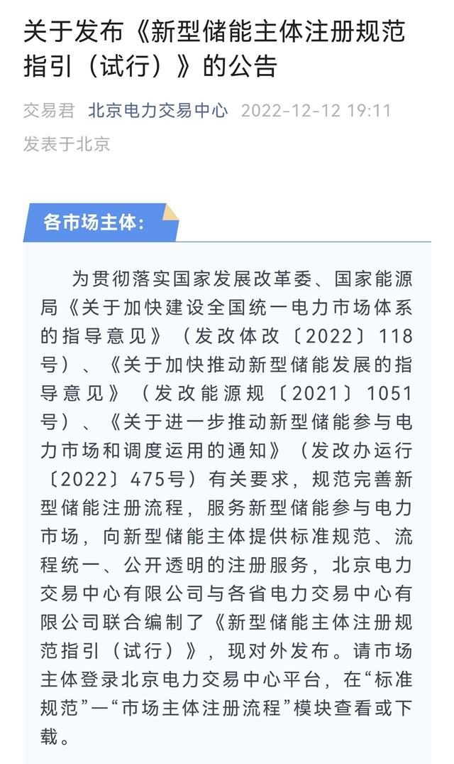 12日晚,北京市電力交易中心發(fā)布《新型儲(chǔ)能主體注冊規(guī)范指引(試行)》公告(下稱《指引》)。這是交易機(jī)構(gòu)首次從實(shí)施層面統(tǒng)一明確將新型儲(chǔ)能作為獨(dú)立于發(fā)電企業(yè)、售電公司和用戶的注冊類型,并且規(guī)范了詳細(xì)的注冊程序與所需信息、資料。