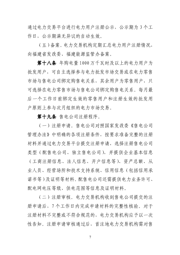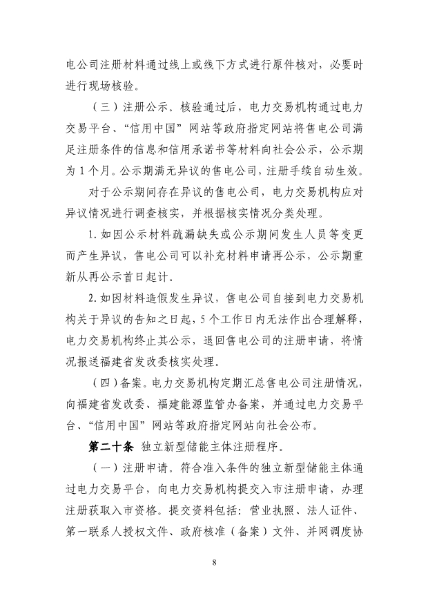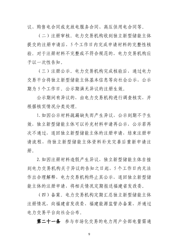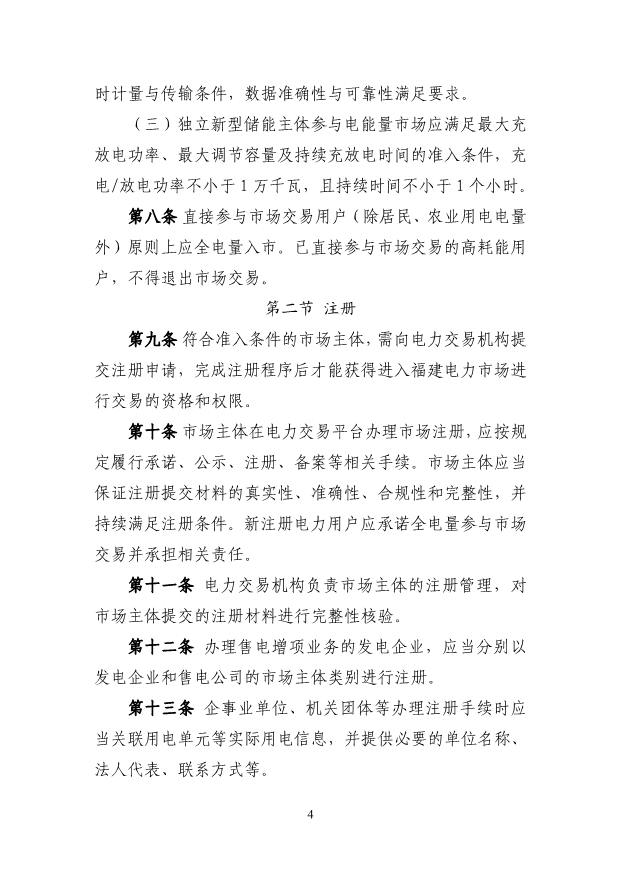 (三)獨(dú)立新型儲(chǔ)能主體參與電能量市場(chǎng)應(yīng)滿(mǎn)足最大充 放電功率、最大調(diào)節(jié)容量及持續(xù)充放電時(shí)間的準(zhǔn)入條件,充 電/放電功率不小于 1 萬(wàn)千瓦,且持續(xù)時(shí)間不小于 1 個(gè)小時(shí)。 第八條 直接參與市場(chǎng)交易用戶(hù)(除居民、農(nóng)業(yè)用電電量 外)原則上應(yīng)全電量入市。已直接參與市場(chǎng)交易的高耗能用 戶(hù),不得退出市場(chǎng)交易。