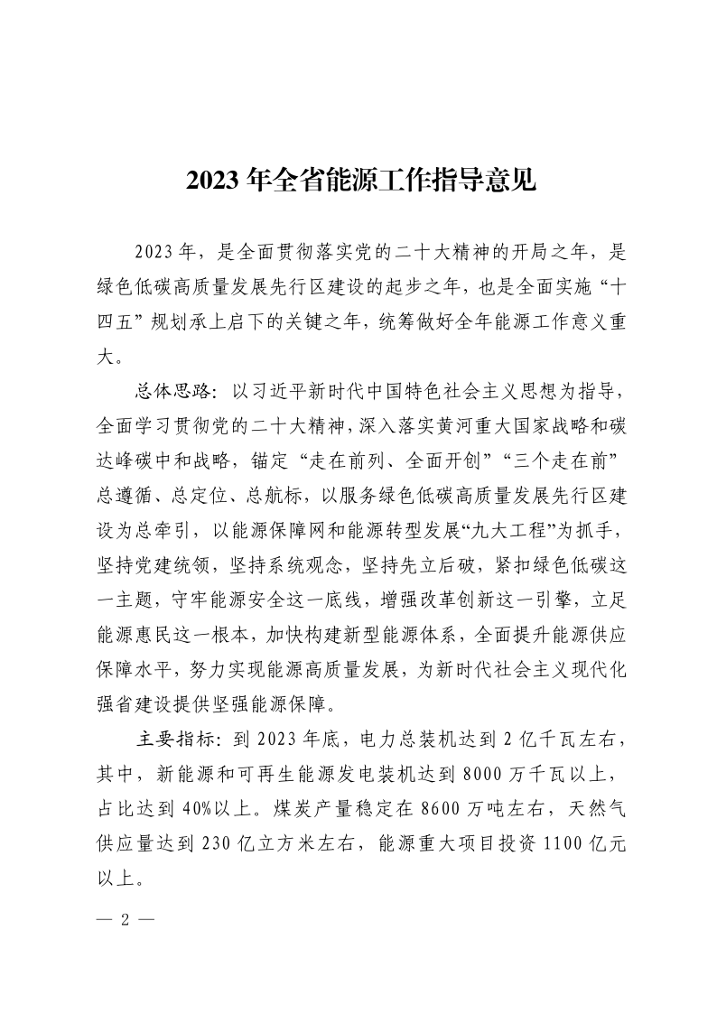 到2023年底,電力總裝機(jī)達(dá)到2億千瓦左右,其中,新能源和可再生能源發(fā)電裝機(jī)達(dá)到8000萬千瓦以上,占比達(dá)到40%以上。煤炭產(chǎn)量穩(wěn)定在8600萬噸左右,天然氣供應(yīng)量達(dá)到230億立方米左右,能源重大項目投資1100億元以上。