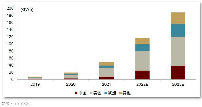 據(jù)中金公司預(yù)測(cè),今年全球儲(chǔ)能需求有望達(dá)189GWh,同比增長(zhǎng)超60%。美國、中國、歐盟成為全球三大儲(chǔ)能市場(chǎng)。