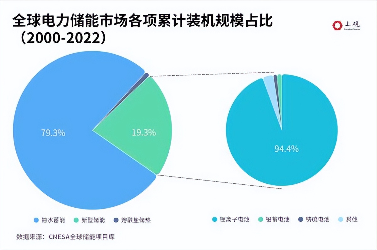 傳統(tǒng)儲(chǔ)能產(chǎn)業(yè)大多利用水勢(shì)高低差進(jìn)行抽水蓄能,這也是目前全球儲(chǔ)能的主要方式,占比近八成。但抽水蓄能受地理資源約束明顯,一般只能建造在山區(qū)與丘陵地帶,且建造成本高、時(shí)間長(zhǎng)。隨著新能源產(chǎn)業(yè)的不斷發(fā)展,以鋰電池儲(chǔ)能為代表的新型儲(chǔ)能產(chǎn)品技術(shù)逐漸成熟、成本下降,迎來了大規(guī)模商業(yè)化的時(shí)機(jī)。