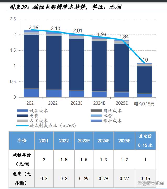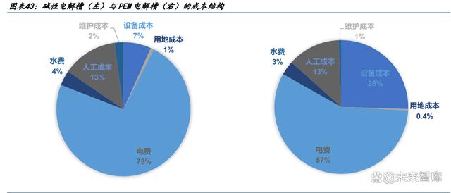 (2)從發(fā)展階段來看,示范階段更注重初裝成本,商業(yè)化運(yùn)營(yíng)需考慮全生命周期成 本。當(dāng)前電解水項(xiàng)目大多處于示范階段,堿性電解槽技術(shù)更成熟、設(shè)備價(jià)格也相對(duì)更 低,示范階段更傾向于堿性電解槽的應(yīng)用。未來進(jìn)入商業(yè)化運(yùn)營(yíng)時(shí),全生命周期成本 成為首要考慮因素,即需加入運(yùn)營(yíng)成本進(jìn)行考量,堿性電解槽運(yùn)營(yíng)成本占其全生命周 期成本的 75%-80%,PEM 則是占 30-40%,在 PEM 電解槽設(shè)備逐年降本以及其更適合與 風(fēng)光耦合的情況下,PEM 電解槽的應(yīng)用將呈現(xiàn)逐年上升趨勢(shì)。