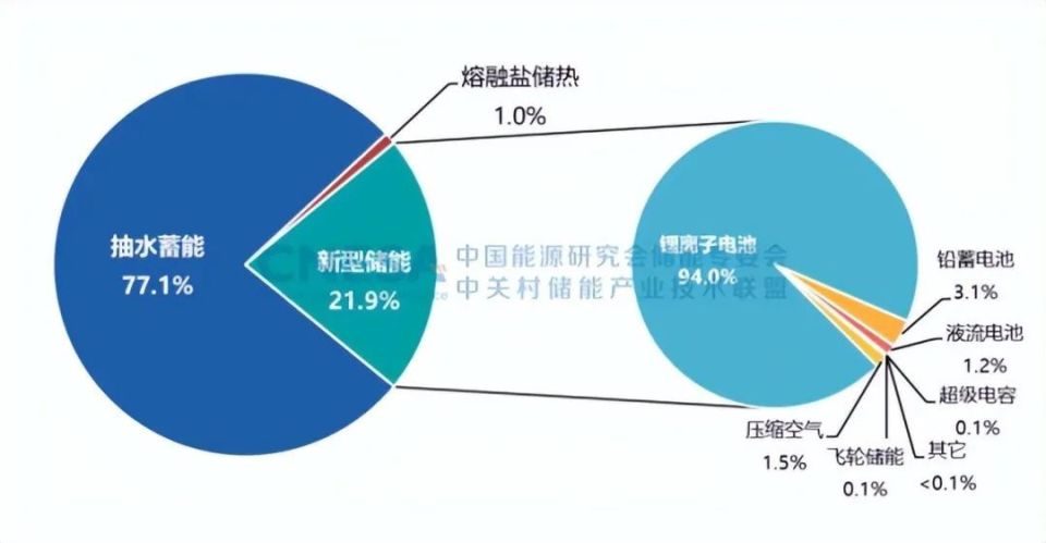 2022年,中國新增投運電力儲能項目裝機規(guī)模首次突破15GW,達到16.5GW,其中,抽水蓄能新增規(guī)模9.1GW,同比增長75%;新型儲能新增規(guī)模創(chuàng)歷史新高,達到7.3GW/15.9GWh,功率規(guī)模同比增長200%,能量規(guī)模同比增長280%;新型儲能中,鋰離子電池占據(jù)絕對主導地位,比重達97%,此外,壓縮空氣儲能、液流電池、鈉離子電池、飛輪等其它技術路線的項目,在規(guī)模上有所突破,應用模式逐漸增多。