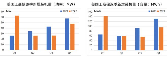 根據(jù)Wood Mackenzie數(shù)據(jù)顯示,2022年美國新增工商儲(chǔ)裝機(jī)容量為164MW/354MWh,同比+1%/+1%。其中,2022Q4新增48MW/96MWh,同比-17%/-27%,環(huán)比+80%/+71%。