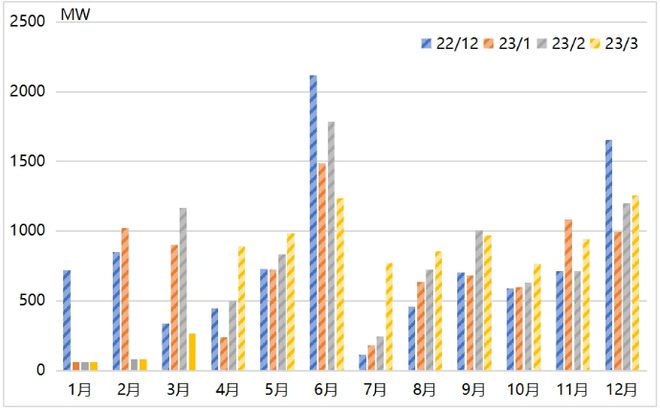 對(duì)比前期(22/12、23/1、23/2)數(shù)據(jù),發(fā)現(xiàn)2023年Q1各月儲(chǔ)能投運(yùn)延期較為顯著,推測(cè)延期原因主要系供應(yīng)鏈問題和并網(wǎng)排隊(duì)等。根據(jù)各期數(shù)據(jù),上半年仍有投運(yùn)小高峰,我們分析認(rèn)為這是因?yàn)槊磕?-8月是美國夏季負(fù)荷高峰,是儲(chǔ)能獲取收益的重要月份,因此6月底前是儲(chǔ)能項(xiàng)目投運(yùn)的重要時(shí)間節(jié)點(diǎn)。