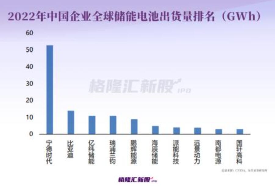 行業(yè)競(jìng)爭(zhēng)方面,根據(jù)SNE Research的數(shù)據(jù),2022年全球儲(chǔ)能電池出貨量排名中,寧德時(shí)代、比亞迪、億緯鋰能分別以53GWh、14GWh和9.5GWh位列前三。