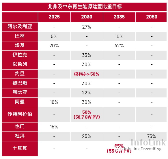 由于既有較成熟市場(chǎng)的商業(yè)模式與供應(yīng)鏈成型,進(jìn)入門坎拉高也更為競(jìng)爭(zhēng),因此新興市場(chǎng)如東南亞、中東、南美、非洲等成為企業(yè)欲搶占布局之區(qū),且受到光伏市場(chǎng)的刺激會(huì)帶動(dòng)儲(chǔ)能維持熱度與需求,應(yīng)用面今年則以表后工商業(yè)更受關(guān)注。然而,大部分此些市場(chǎng)的政策、程序、供應(yīng)鏈、再生能源規(guī)模、電網(wǎng)、建設(shè)環(huán)境等都遠(yuǎn)不如較成熟市場(chǎng),相對(duì)也就需要更長(zhǎng)的爬坡期且影響發(fā)展速率變量更多,導(dǎo)致該市場(chǎng)可能大幅起落。例如,新興市場(chǎng)目前出臺(tái)的政策多是以整體再生能源建置為目標(biāo),對(duì)于儲(chǔ)能的需求或發(fā)展尚無(wú)明確指引,以下表整理的北非與中東為例;其次,中國(guó)六月份的儲(chǔ)能裝機(jī)規(guī)模中工商業(yè)占比僅1%,說(shuō)明市場(chǎng)需求與情緒雖旺盛,但實(shí)際規(guī)模需更審慎評(píng)估。