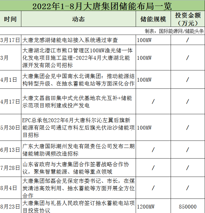 據(jù)不完全統(tǒng)計,2022年1-8月,大唐集團(tuán)儲能項目招標(biāo)3個,與山東、保定、南水北調(diào)集團(tuán)等簽訂合作協(xié)議,涉及抽水蓄能、智慧能源等領(lǐng)域。