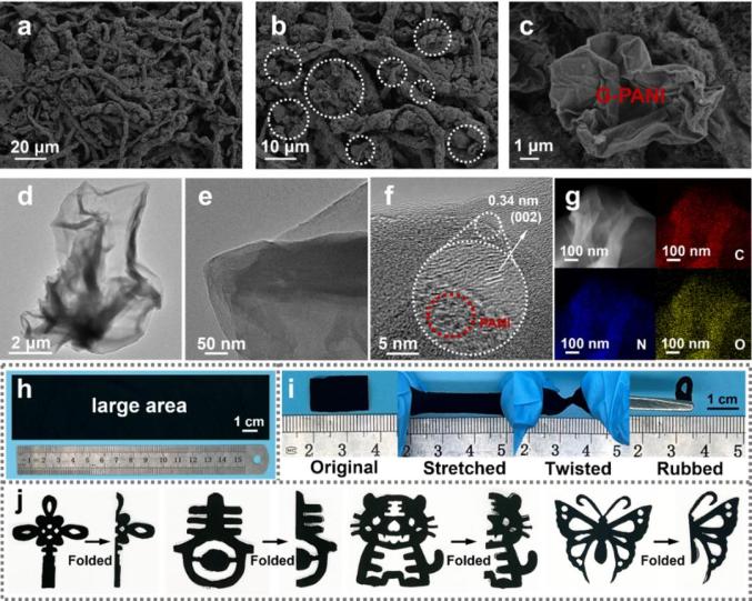 圖2 G-PANI@pcPU織物的形貌表征、大規(guī)模制備、可形變性能