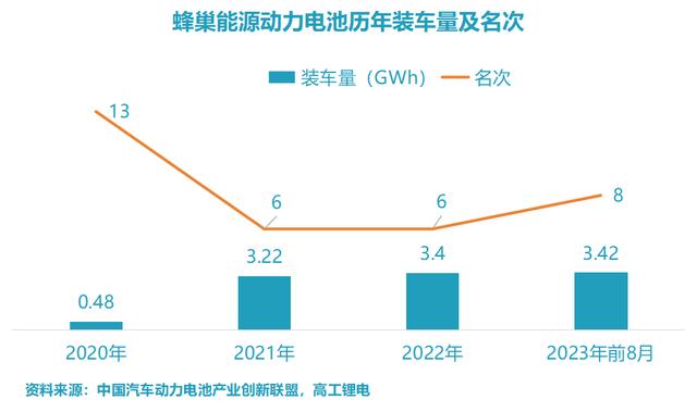 好在,6月開始,蜂巢能源重拾升勢,一個月一臺階。8月,蜂巢能源裝車量0.79GWh,排名國內第六。1-8月,蜂巢能源總裝車3.42GWh,已經追平2022年,排名國內第八。