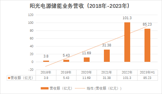 除了出貨量之外,業(yè)績,也是一面鏡子,它是公司過往戰(zhàn)略的倒影。儲能營收的飛速增長,無疑也印證了陽光電源儲能布局和戰(zhàn)略定位的成功。2023年4月25日,陽光電源披露2022年年度報告,其儲能系統(tǒng)營收實現(xiàn)101.26億,首次破百億。2023年半年報顯示,僅半年其儲能營收已經(jīng)高達85.23億。