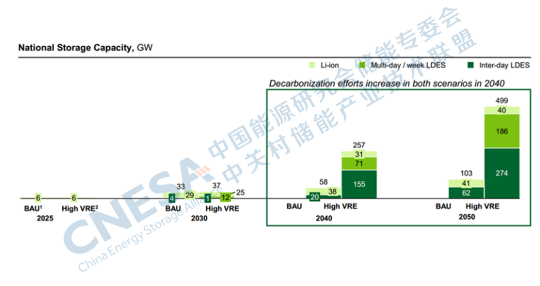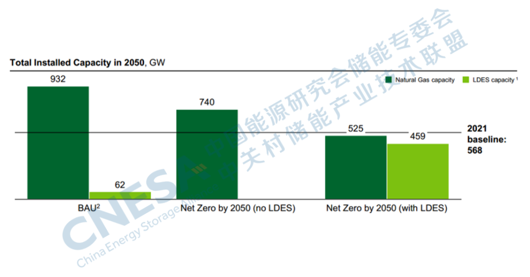圖2:2050年實(shí)現(xiàn)BAU和Net Zero脫碳目標(biāo)下的LDES預(yù)測