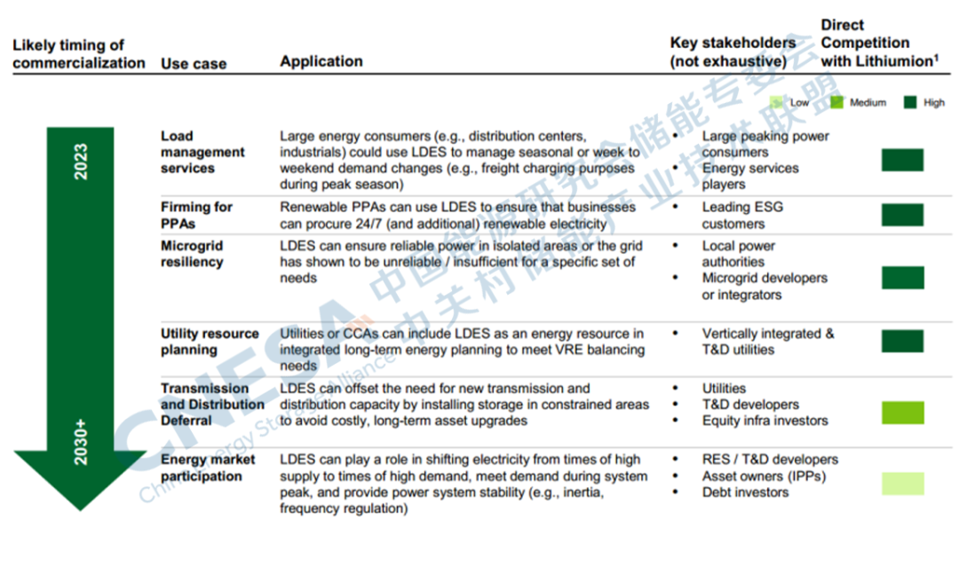 從應(yīng)用場景上講,LDES在用電負(fù)荷管理,電力購買協(xié)議,微網(wǎng)韌性和電力資源規(guī)劃等應(yīng)用場景與鋰電有較強(qiáng)的競爭關(guān)系,而在推遲輸配電網(wǎng)建設(shè)和參加電力市場方面的競爭關(guān)系相對較弱。