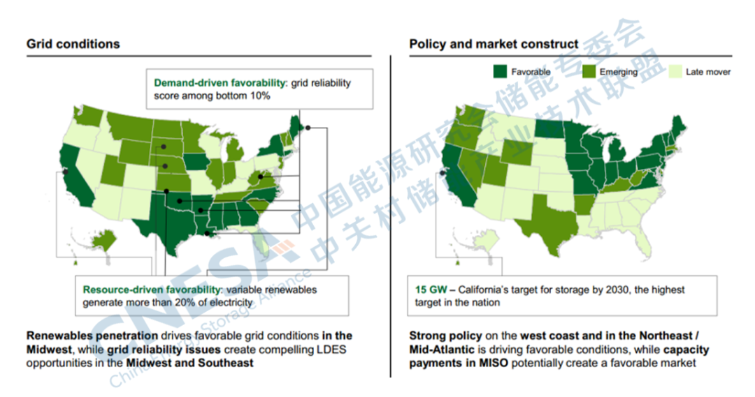在美國由于不同的電網(wǎng)條件、政策和市場結(jié)構(gòu),LDES部署的就緒程度各不相同。報告指出:有兩個因素可以用來評估市場LDES的就緒程度:電網(wǎng)條件、政策和市場結(jié)構(gòu)。一是電網(wǎng)條件。衡量LDES在特定狀態(tài)下的可獲得性和相對可行性,以及整體發(fā)電組合。影響因素包括間歇性可再生能源的滲透率百分比、輸配電投資缺口、SAIDI/SAIFI得分衡量的電網(wǎng)彈性以及互聯(lián)的難易程度。二是政策和市場結(jié)構(gòu)。衡量地方政策和收入結(jié)構(gòu)對在該州部署具有有利風(fēng)險調(diào)整回報預(yù)期的LDES的有利程度。影響因素包括可再生能源投資組合標(biāo)準(zhǔn)(RPSs)、是否有容量支付以及支付的水平等。通過評估,可以得出加利福尼亞、德克薩斯、紐約、緬因州、愛荷華州和康涅狄格州在近期內(nèi)具有很高的潛力(圖8)。