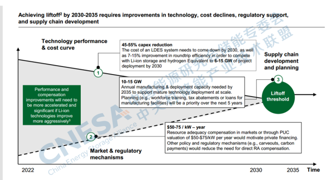 備注:圖中PUC代表公共事業(yè)委員會,RA代表資源充足。起飛點(diǎn)被定義為LDES行業(yè)成為一個很大程度上自我維持的市場;在鋰離子電池競爭的情況下,仍然需要多日/周的LDES技術(shù),而積極的鋰離子電池將減少供應(yīng)鏈建設(shè)的需求。