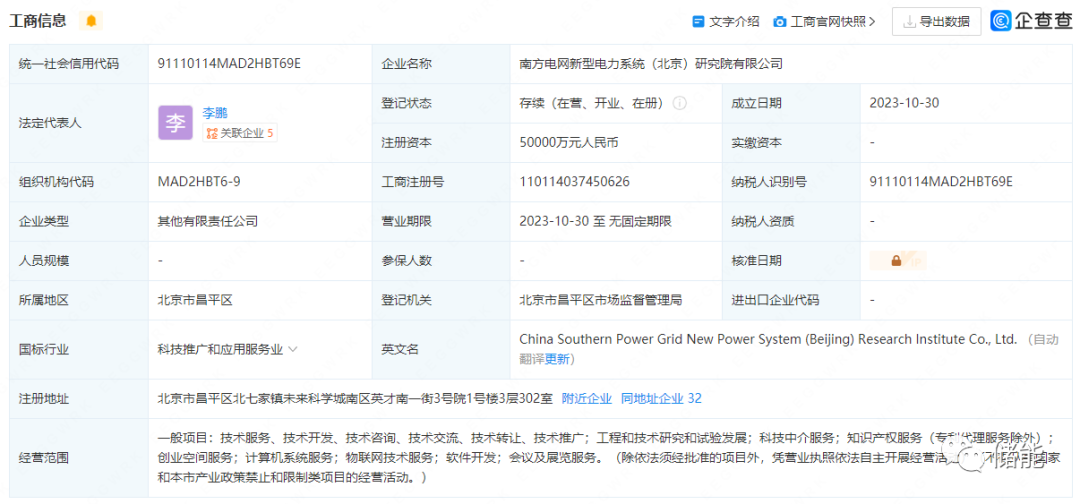 10月30日,南方電網(wǎng)新型電力系統(tǒng)(北京)研究院有限公司注冊成立,法定代表人為李鵬,注冊資本5億元人民幣,該公司由中國南方電網(wǎng)有限責任公司及旗下南方電網(wǎng)數(shù)字電網(wǎng)集團有限公司、南方電網(wǎng)科學(xué)研究院有限責任公司共同持股。