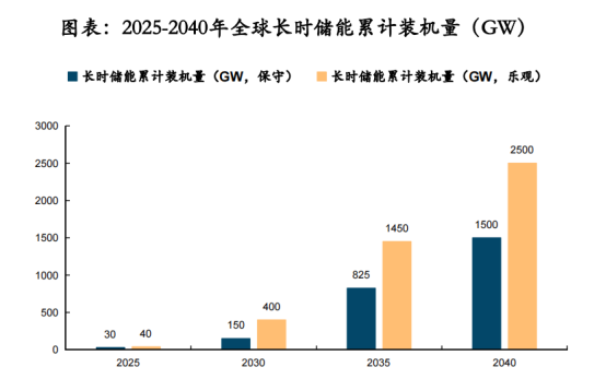 由中國(guó)能源研究會(huì)發(fā)布的《構(gòu)建新型電力系統(tǒng)路徑研究》報(bào)告顯示,2020—2030年,新能源在國(guó)家能源結(jié)構(gòu)中的占比將逐步提高,預(yù)計(jì)風(fēng)光發(fā)電占比將從2020年的9.3%提高到2030年的22.5%。根據(jù)麥肯錫數(shù)據(jù),長(zhǎng)時(shí)儲(chǔ)能于2025年起開始大規(guī)模增長(zhǎng)。2030年起全球可再生能源滲透率將升至約60%—70%,長(zhǎng)時(shí)儲(chǔ)能累計(jì)裝機(jī)量將達(dá)到150-400GW(對(duì)應(yīng)儲(chǔ)能容量5-10TWh),累計(jì)投資規(guī)模將達(dá)到2000億-5000億美元。到2040年,長(zhǎng)時(shí)儲(chǔ)能累計(jì)裝機(jī)量將加速達(dá)到1.5-2.5TW(對(duì)應(yīng)儲(chǔ)能容量85-140TWh),是目前全球儲(chǔ)能系統(tǒng)裝機(jī)量的8-15倍,累計(jì)投資額將達(dá)到1.5萬(wàn)億-3萬(wàn)億美元。