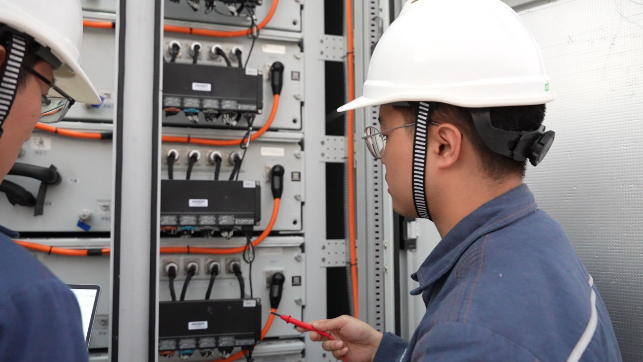 而在結(jié)構(gòu)連接方面,寶塘儲(chǔ)能站的連接方式多達(dá)5種,組串式、雙極式、單極式、低壓級(jí)聯(lián)、高壓級(jí)聯(lián)。其中,“高壓級(jí)聯(lián)”是南方電網(wǎng)首批“揭榜掛帥制”科研項(xiàng)目的攻關(guān)技術(shù),實(shí)體成果“我國(guó)首個(gè)高壓移動(dòng)式儲(chǔ)能站”于2023年初在河北保定投運(yùn)。這種新技術(shù)通過(guò)模塊級(jí)聯(lián)的方式將儲(chǔ)能系統(tǒng)電壓直接升至10千伏,在大幅減少儲(chǔ)能系統(tǒng)數(shù)量的情況下實(shí)現(xiàn)同等效率,省去變壓器的儲(chǔ)能系統(tǒng)可靈活移動(dòng),解決了傳統(tǒng)儲(chǔ)能應(yīng)用場(chǎng)景受限的問(wèn)題,迅速成為行業(yè)研發(fā)應(yīng)用的“熱門(mén)”。“安裝在寶塘儲(chǔ)能站的兩套高壓級(jí)聯(lián)儲(chǔ)能系統(tǒng),相對(duì)于河北保定系統(tǒng),硬件結(jié)構(gòu)及控制保護(hù)方面均實(shí)現(xiàn)了技術(shù)優(yōu)化,綜合性能更優(yōu)。”南網(wǎng)儲(chǔ)能高壓級(jí)聯(lián)攻關(guān)團(tuán)隊(duì)成員李勇琦指著新投運(yùn)的高壓級(jí)聯(lián)電池艙說(shuō)道。