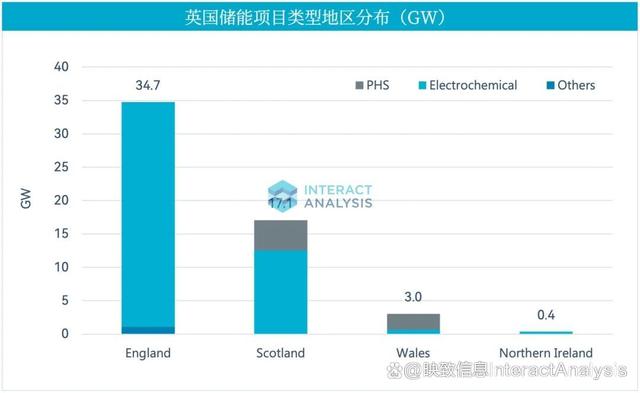 英國是全球重要的新型儲能市場,與德意等以戶儲為主的歐洲國家不同,大規(guī)模儲能在英國占據(jù)主導地位。據(jù)Interact Analysis全球儲能項目統(tǒng)計,截至2023年底,英國儲能項目總規(guī)模約55GW(含在規(guī)劃、在建及已投運的儲能項目),其中規(guī)劃及在建項目50GW。抽水蓄能項目總規(guī)模約6.7GW,新型儲能項目規(guī)模超48GW。