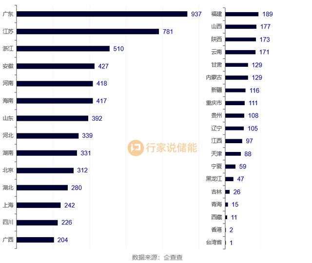 分區(qū)域來看,新增儲(chǔ)能企業(yè)主要分布在廣東、江蘇、浙江等地。