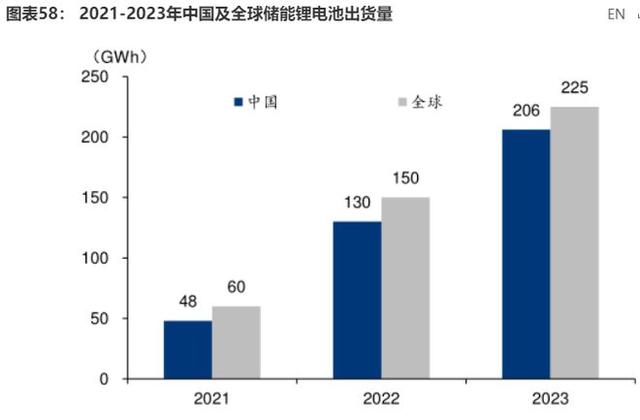 首先,鋰電池儲能在新型儲能裝機中占據絕對主導地位,將在較長時期作為儲能建設的主力,因此,儲能也成為鋰電池廠商兵家必爭之地。根據GGII,2023年全球儲能鋰電池出貨225GWh,同比增長50%,其中我國儲能鋰電池出貨206GWh,同比增長58%。國內企業(yè)出貨在全球占比由2022年的86.7%提升至2023年的91.6%,寧德時代、比亞迪、億緯鋰能、瑞浦蘭鈞、海辰儲能等企業(yè)出貨領跑行業(yè)。
