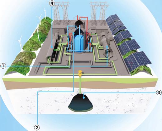 第四步 釋放、加熱鹽穴內(nèi)高壓空氣,驅(qū)動(dòng)膨脹機(jī)帶動(dòng)發(fā)電機(jī)發(fā)電 應(yīng)用多級(jí)高負(fù)荷透平膨脹機(jī)設(shè)計(jì)技術(shù),攻克全三維設(shè)計(jì)、復(fù)雜軸系結(jié)構(gòu)、動(dòng)態(tài)調(diào)節(jié)與控制等關(guān)鍵技術(shù),研制出的300兆瓦級(jí)膨脹機(jī),具有負(fù)荷高、流量大、流動(dòng)傳熱復(fù)雜等特點(diǎn)。