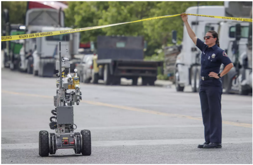 加州消防官員舉起警戒線(xiàn),允許機(jī)器人進(jìn)入設(shè)施。(攝影:Sandy Huffaker,為《圣地亞哥聯(lián)合論壇報(bào)》提供)