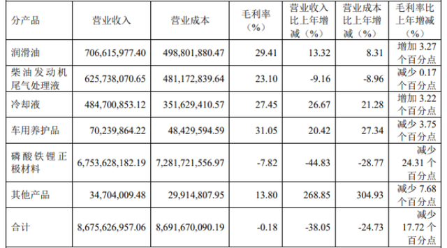 但有兩項業(yè)務(wù)收入同比下滑,其中柴油發(fā)動機尾氣處理液收入同比下降9.16%至6.26億元;磷酸鐵鋰正極材料產(chǎn)品實現(xiàn)營收67.54億元,同比下降44.83%??梢哉f收入占比達78%的磷酸鐵鋰正極材料極大地拉低了整體收入水平。