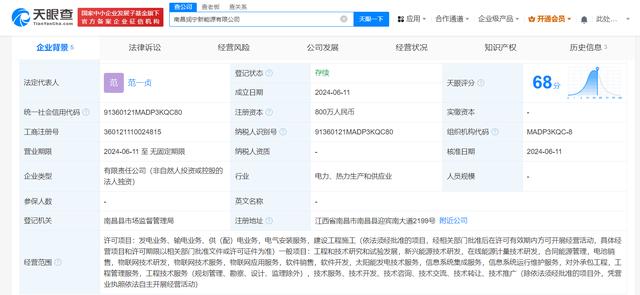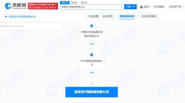 近日,南昌潤寧新能源有限公司成立,法定代表人為范一貞,注冊資本800萬人民幣,經(jīng)營范圍含工程和技術(shù)研究和試驗發(fā)展、新興能源技術(shù)研發(fā)、在線能源計量技術(shù)研發(fā)、合同能源管理、電池銷售等。股權(quán)全景穿透圖顯示,該公司由時代綠色能源有限公司全資持股,后者為寧德時代(300750)全資子公司。