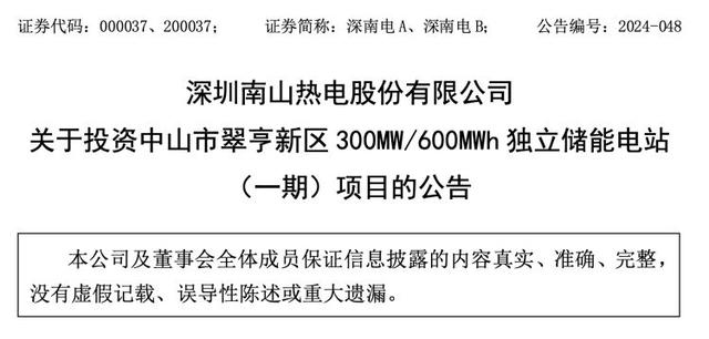 目的及影響方面,深南電A表示,投資中山市翠亨新區(qū)300MW/600MWh獨立儲能電站(一期)項目符合公司在新形勢下戰(zhàn)略發(fā)展的需求,有利于推動公司在大型儲能領(lǐng)域的探索與實踐,助力公司向綜合能源服務(wù)轉(zhuǎn)型;有利于公司充分利用現(xiàn)有資源,打造新型商業(yè)模式,推動公司全面轉(zhuǎn)型發(fā)展;有利于中山市深入貫徹落實“雙碳”政策,打造獨立儲能項目示范,協(xié)同儲能相關(guān)產(chǎn)業(yè)鏈;有利于盤活中山公司線路資產(chǎn),促進國有資產(chǎn)的提質(zhì)增效。在確保公司日常經(jīng)營和資金安全的前提下,使用中山公司線路資產(chǎn)投資中山市翠亨新區(qū)300MW/600MWh獨立儲能電站(一期)項目不影響公司日常資金周轉(zhuǎn)需要,不影響公司生產(chǎn)經(jīng)營的正常開展。中山市翠亨新區(qū)300MW/600MWh獨立儲能電站(一期)項目產(chǎn)業(yè)方向符合公司未來的戰(zhàn)略布局,將會對公司未來的財務(wù)狀況及長遠(yuǎn)發(fā)展產(chǎn)生積極影響。