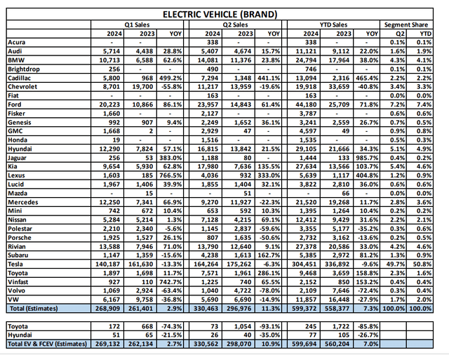 然而,由于競爭的影響,特斯拉第二季度的美國電動汽車市場份額首次跌破50%的門檻,降至49.7%。盡管特斯拉銷量下滑,但縱觀第二季度全美純電市場,整體同比增長了11.3%,雖然與上年同期相比,增速放緩,但上升趨勢也說明美國消費市場對電動汽車仍有一定的需求。