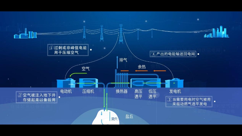 儲能時,利用過?;蚍欠逯惦娔茯?qū)動電動機(jī)旋轉(zhuǎn),將電能轉(zhuǎn)化為機(jī)械能,電動機(jī)帶動壓縮機(jī)(一種將低壓氣體提升為高壓氣體的機(jī)械)將空氣從低壓狀態(tài)壓縮至高壓狀態(tài),并將高壓空氣儲存在儲氣裝置(鹽穴、人工硐室或儲氣罐)中,最終將電能轉(zhuǎn)換成空氣熱能和壓力能。