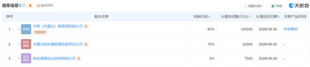 據(jù)信息顯示,內(nèi)蒙古華電阿拉善綠色能源有限公司的法定代表人是盧茂茂。該公司由華電(內(nèi)蒙古)新能源有限公司、內(nèi)蒙古阿拉善能源有限責任公司、以及阿拉善盟運達風電有限公司共同持有股份,其中中國華電旗下的華電(內(nèi)蒙古)新能源有限公司持有80%的股份。