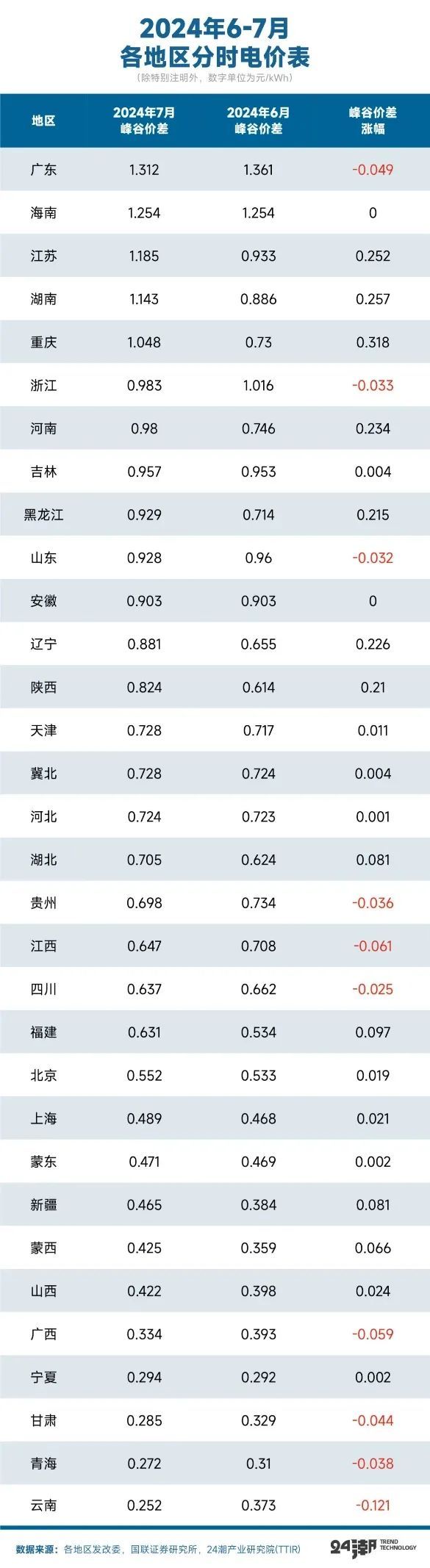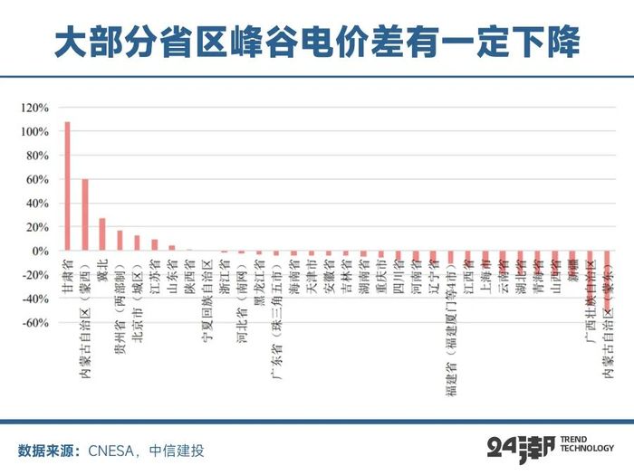 這并非危言聳聽,根據(jù)東海證券統(tǒng)計,今年以來浙江、河南、江蘇多地發(fā)布分時電價調(diào)整政策,全國范圍內(nèi)峰谷電價差縮窄趨勢顯著,河南省分時電價調(diào)整新政亦正式落地。此外根據(jù)中關(guān)村儲能聯(lián)盟對32個省區(qū)的分析,今年1-8月份一般工商業(yè)1-10kV電網(wǎng)代理購電最大峰谷價差平均為0.68元/kWh,較2023年同比下降了6.7%。與2023年1-8月相比,今年各地最大峰谷價差普遍呈現(xiàn)下降趨勢,僅甘肅、蒙西、冀北等8個地區(qū)價差有所提高,其他地區(qū)均為下降。