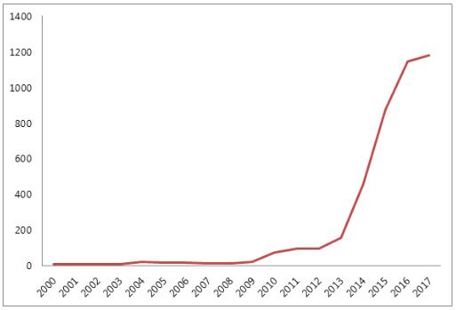 根據(jù)韓國特許廳的數(shù)據(jù)顯示,截止至2012年,IoT服務(wù)相關(guān)的專利申請量年均不到100件,而在2017年的申請量驟增11倍,達到了1179件。