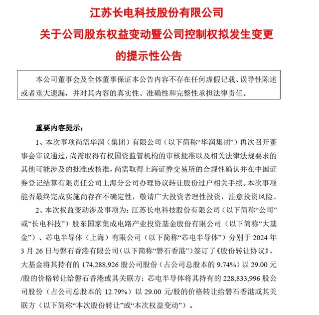 3月26日晚間,長電科技(SH600584,股價28.25元,市值505.3億元)發(fā)布公告稱,公司股東國家集成電路產(chǎn)業(yè)投資基金股份有限公司(以下簡稱“大基金”)、芯電半導體(上海)有限公司(以下簡稱“芯電半導體”)分別與磐石香港有限公司(以下簡稱“磐石香港”)簽訂《股份轉(zhuǎn)讓協(xié)議》,大基金及芯電半導體均以29元/股價格將合計所持22.53%公司股份轉(zhuǎn)讓給磐石香港或其關(guān)聯(lián)方;完成后公司控股股東將變更為磐石香港或其關(guān)聯(lián)方,實控人將變更為中國華潤,公司股票復牌。