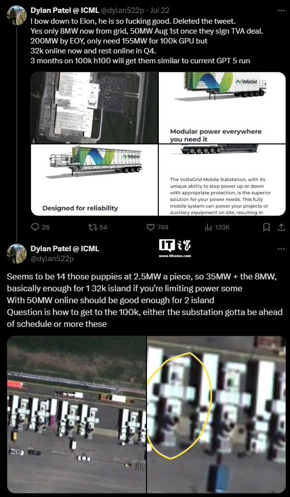 如果田納西河谷管理局在 8 月初為其提供所需的 50 兆瓦電力,馬斯克將有足夠的電力同時運(yùn)行 6.4 萬個 GPU。Patel 表示,運(yùn)行 10 萬個 GPU 需要 155 兆瓦電力,但 xAI 需要變電站才能達(dá)到這個水平。因此,要么變電站提前完工,要么馬斯克將部署更多移動發(fā)電機(jī)來滿足電力需求。