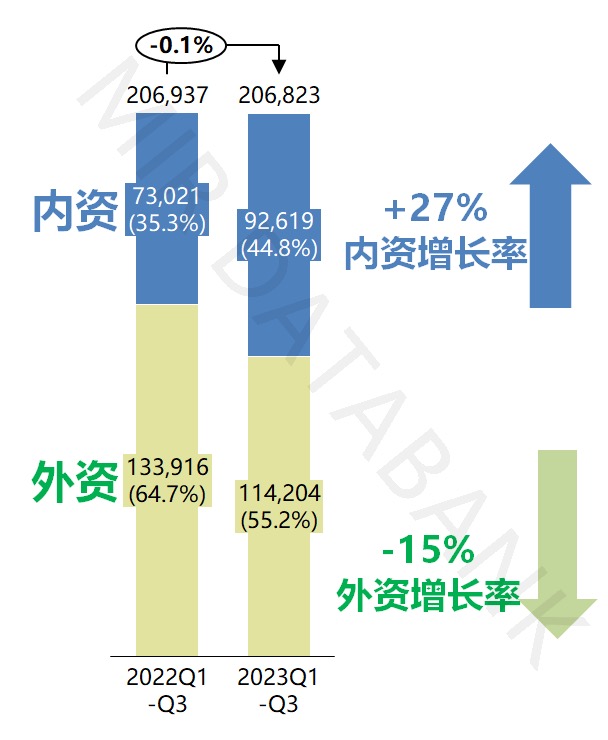 但我國近年來國產替代加速,導致內資廠商市場份額不斷提升。據MIR睿工業(yè)數據:2023年第三季度,國產工業(yè)機器人廠商扛住了壓力,同比增速達26.8%,遠高于整體市場增速。且內資廠商市場份額持續(xù)增加,占比提升至45%。