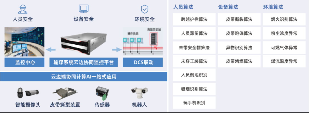 方案通過云邊端協(xié)同架構(gòu)把智能采集裝置、皮帶撕裂識別裝置、環(huán)境傳感器等進(jìn)行數(shù)據(jù)的統(tǒng)一匯聚分析,對異常情況進(jìn)行識別和報警,并通過DCS系統(tǒng)控制聯(lián)動,提高人員、設(shè)備、環(huán)境的安全管理水平。 在設(shè)備故障監(jiān)測方面,可對皮帶異物、落煤口堵煤、皮帶跑偏、運(yùn)行環(huán)境火花等情況進(jìn)行識別,避免異物運(yùn)輸對皮帶造成意外損傷或引發(fā)事故;在人員安全管控方面,設(shè)置吸煙、安全帽佩戴、翻越護(hù)欄、人員倒地等相關(guān)算法,對巡檢人員的不安全行為進(jìn)行識別管控;在環(huán)境監(jiān)控方面,通過安裝布設(shè)有毒有害氣體監(jiān)測傳感器、溫度傳感器、粉塵監(jiān)測傳感器等對輸煤環(huán)境進(jìn)行在線實時監(jiān)測,及時發(fā)現(xiàn)高溫、有毒有害氣體超標(biāo)、粉塵濃度超標(biāo)并預(yù)警,最大程度保障人員操作環(huán)境安全。