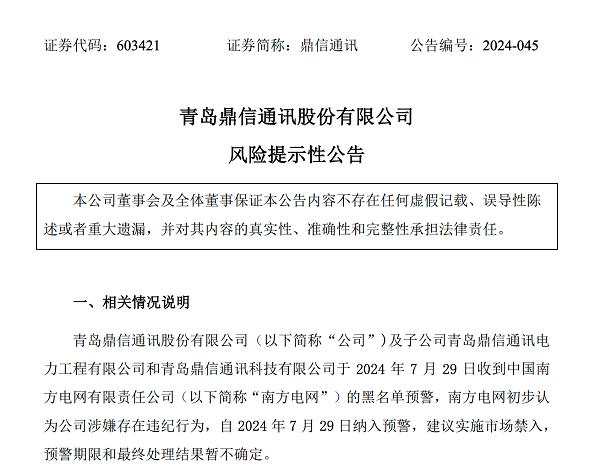 7月30日,鼎信通訊(603421.SH)提示風險,公司及子公司于7月29日收到中國南方電網有限責任公司(以下簡稱“南方電網”)的黑名單預警,南方電網初步認為公司涉嫌存在違紀行為,自2024年7月29日納入預警,建議實施市場禁入,預警期限和最終處理結果暫不確定。