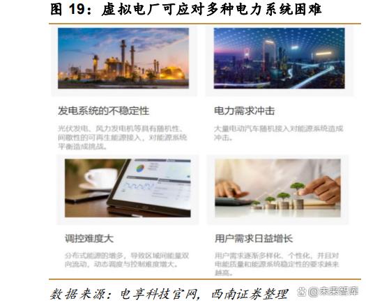 虛擬電廠具有需求側響應、多負荷管理等多種功能,可應對發(fā)電系統(tǒng)多樣化困難。虛擬 電廠可以應對發(fā)電系統(tǒng)不穩(wěn)定性(風光隨機性和間歇性對能源系統(tǒng)平衡造成挑戰(zhàn))、電力需 求沖擊(大量電動汽車隨機接入,對能源系統(tǒng)造成沖擊)、調(diào)控難度大(分布式能源增多, 導致動態(tài)調(diào)度與控制難度提升)和用戶需求日益提升等多種困難。