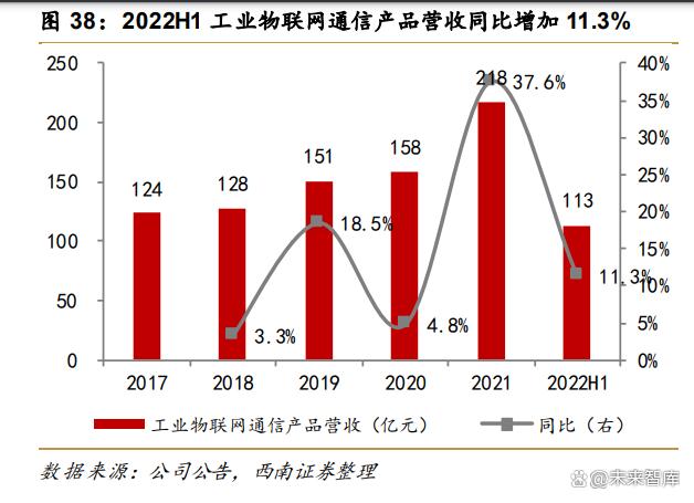 公司系工業(yè)物聯(lián)網(wǎng)龍頭,產(chǎn)品適用范圍廣。公司深耕工業(yè)物聯(lián)網(wǎng)二十年,在智能電力、 智能制造、智能零售、智慧城市等領域積累了諸多國內(nèi)外優(yōu)質客戶,市場涵蓋中國、美國、 德國、英國等全球主要發(fā)達工業(yè)國家,良好的客戶資源為公司持續(xù)穩(wěn)定發(fā)展提供了有力保障。 工業(yè)物聯(lián)網(wǎng)通信產(chǎn)品可適用于各種工業(yè)領域,用于各種無人值守環(huán)境下工業(yè)設備的聯(lián)網(wǎng), 2021 年工業(yè)物聯(lián)網(wǎng)通信產(chǎn)品營收達 218 億元,同比高增 37.6%,2022H1 營收 113 億元, 同比增加 11.3%。