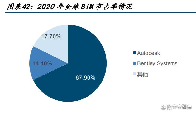 信創(chuàng)發(fā)展背景下,BIM 行業(yè)國產(chǎn)化替代需求強烈。信息技術(shù)應用創(chuàng)新為近年以來我國關鍵 命題,旨在通過對 IT 硬件、軟件的重構(gòu),建立我國自主可控的 IT 產(chǎn)業(yè)標準和生態(tài),逐步 實現(xiàn)各環(huán)節(jié)國產(chǎn)替代。國內(nèi)使用的 BIM 平臺主要為國外軟件,而國內(nèi)廠商主要以項目管理 和單點應用類型的產(chǎn)品為主,底層核心技術(shù)大多掌握在國外廠商手中。2020 年全球 BIM 行業(yè)市場中,Autodesk 市占率為 67.9%,其次 Bentley Systems 市占率為 14.37%,CR2 集中度較高,顯示出國產(chǎn)替代的必要性和緊迫性。