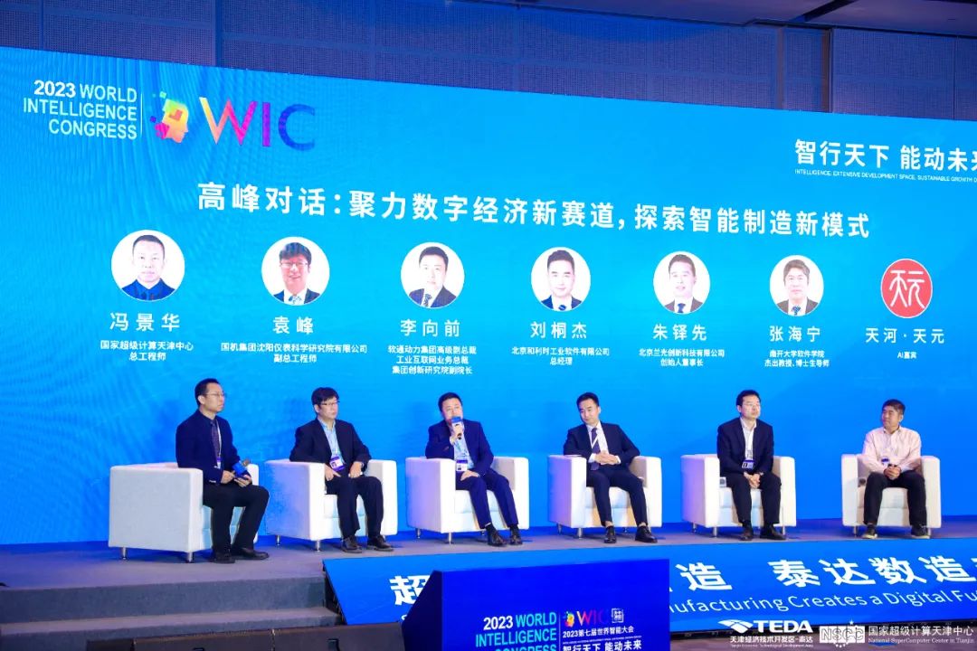 高峰對話環(huán)節(jié)由國家超級計算天津中心總工程師馮景華主持,圍繞“聚力數(shù)字經(jīng)濟(jì)新賽道,探索智能制造新模式”主題展開探討。國機集團(tuán)沈陽儀表科學(xué)研究院有限公司副總工程師袁峰;軟通動力集團(tuán)高級副總裁,工業(yè)互聯(lián)網(wǎng)業(yè)務(wù)總裁,集團(tuán)創(chuàng)新研究院副院長、李向前;北京和利時工業(yè)軟件有限公司總經(jīng)理、劉桐杰;北京蘭光創(chuàng)新科技有限公司創(chuàng)始人、董事長,朱鐸先;南開大學(xué)軟件學(xué)院、杰出教授、博士生導(dǎo)師、張海寧;以及神秘的 AI 嘉賓-天河·天元,現(xiàn)場共話智能制造新模式,推動數(shù)字經(jīng)濟(jì)發(fā)展。
