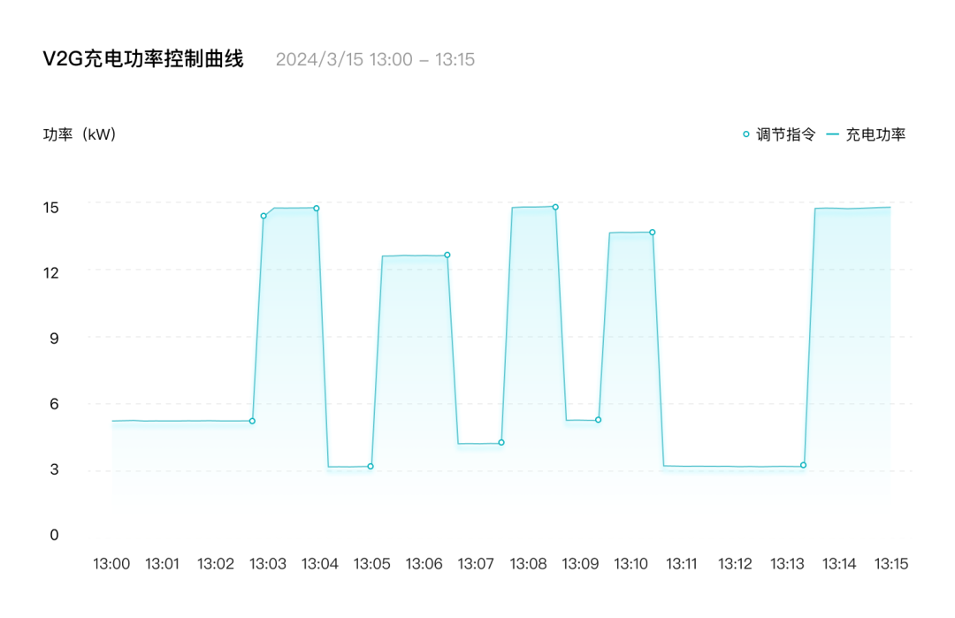 本次試驗(yàn)設(shè)備采用廣汽能源20kW一體式V2G充電樁及昊鉑HT車型,試驗(yàn)中,廣汽能源智慧管理云平臺(tái)模擬接收電網(wǎng)調(diào)控中心(虛擬電廠)的調(diào)頻指令,然后通過ADR技術(shù)連續(xù)15分鐘自動(dòng)控制V2G充電及放電功率,秒級(jí)響應(yīng)虛擬電廠的調(diào)頻需求。