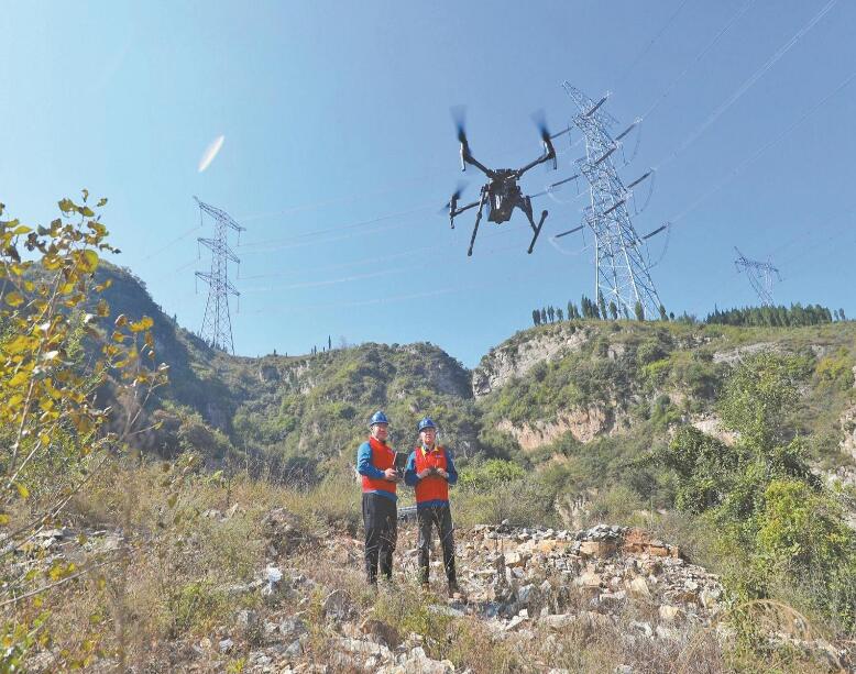 黨員服務(wù)隊隊員利用無人機巡檢1000千伏泉樂線。隗茂春 攝