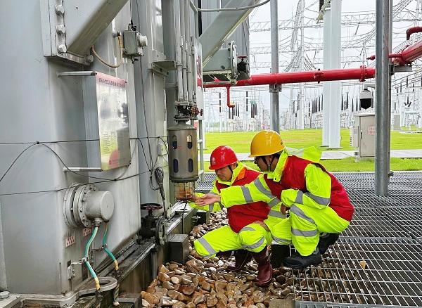圖說:國網(wǎng)上海超高壓公司1000千伏練塘站運(yùn)維人員檢查特高壓主變運(yùn)行情況