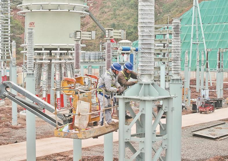 2月11日,國(guó)網(wǎng)重慶電力作業(yè)人員在渝北換流站直流場(chǎng)緊固支柱絕緣子。 劉芮函 攝