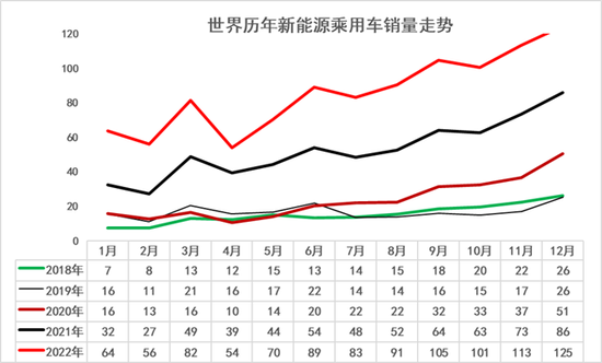 2022年世界新能源車(chē)起步較強(qiáng),1-3月基本實(shí)現(xiàn)強(qiáng)勢(shì)高增長(zhǎng),4-5月的新能源走勢(shì)放緩并劇烈下滑,6-12月世界新能源銷(xiāo)量持續(xù)較強(qiáng)增長(zhǎng)。